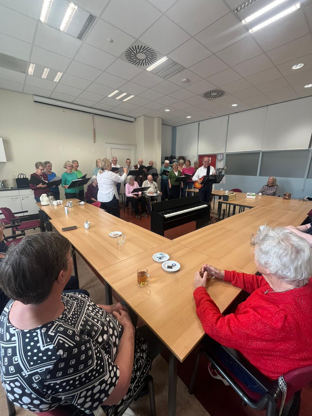 Ik denk wel dat ik voor iedereen spreek als ik zeg dat het heerlijk is om samen te zingen, maar misschien zelfs nog leuker om dat plezier uit te dragen en met anderen te delen. Wat ik zelf als betrekkelijke nieuwkomer elke keer merk is hoe we onszelf bij zo’n optreden toch boven onszelf uit tillen. Zeker in Sassenheim gingen liedjes eigenlijk wonderwel goed waar we tijdens repetities best wel mee worstelden. Ik vond dat het mooi klonk!