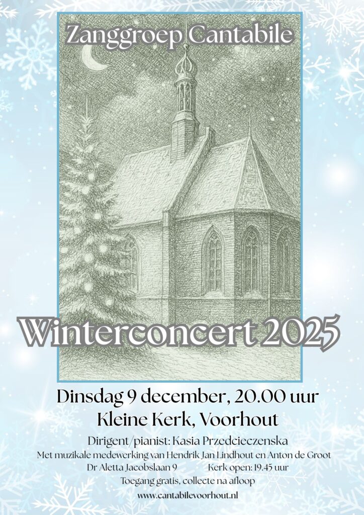 Op 17 december 2024 vond het jaarlijkse Winterconcert van zanggroep Cantabile weer plaats in de Kleine Kerk van Voorhout. Zoals altijd was het programma een sprankelende mix van kerstklassiekers en winterse sfeermuziek.